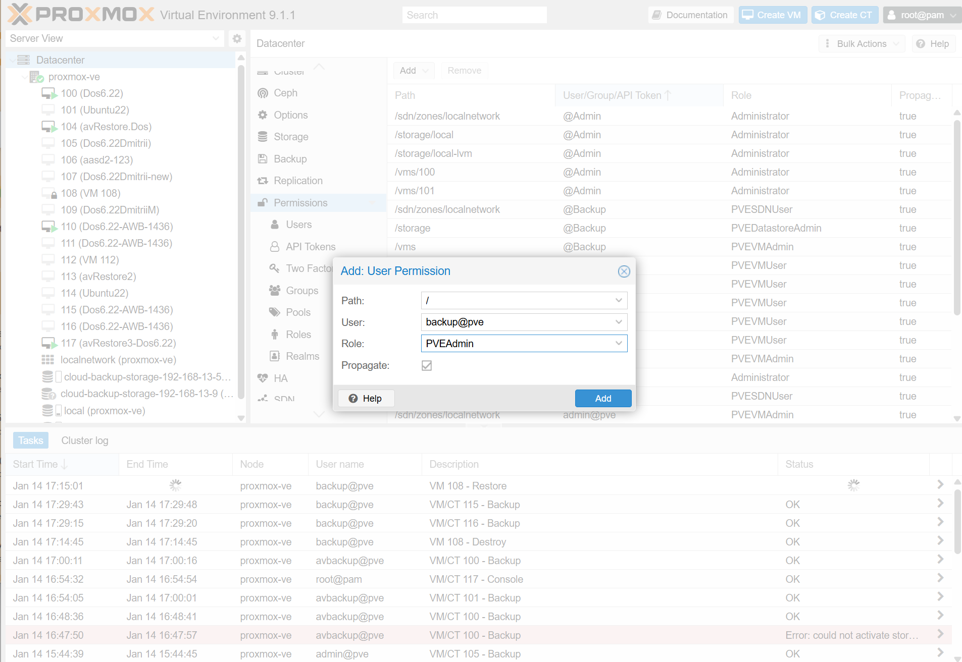 | PVEDatastoreAdmin | Allows reading datastore contents and allocating space, which is essential for backup and restore tasks |
