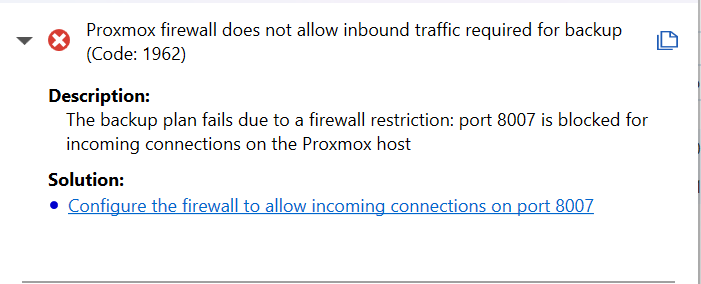 An image-based backup plan finishes with the following warning: Proxmox firewall does not allow inbound traffic required for backup (Code: 1962). The backup plan fails due to a firewall restriction: port 8007 is blocked for incoming connections on the Proxmox host