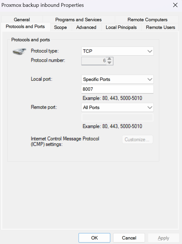 Proxmox inbound port can be open by clicking the solution in the warning message. This creates a new inbound rule in Windows Defender Firewall: