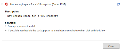 Backup plan fails with the following error Not enough space to create VSS snapshot.... A VSS snapshot requires free space on the source volume to operate or to be created. On a completely idle volume, the snapshot will consume a minimal amount of space. However, if data is modified, deleted, or added to the volume while the snapshot exists, the snapshot's storage needs can grow significantly, potentially leading to a failure. This error can be generated: At a VSS snapshot creation: