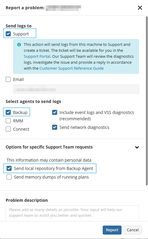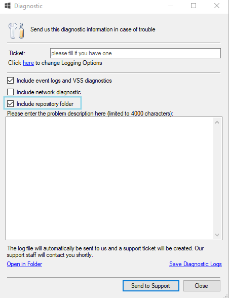 Starting from Backup Agent 8.3, the ability to send the local repository with the Diagnostic Logs was introduced.