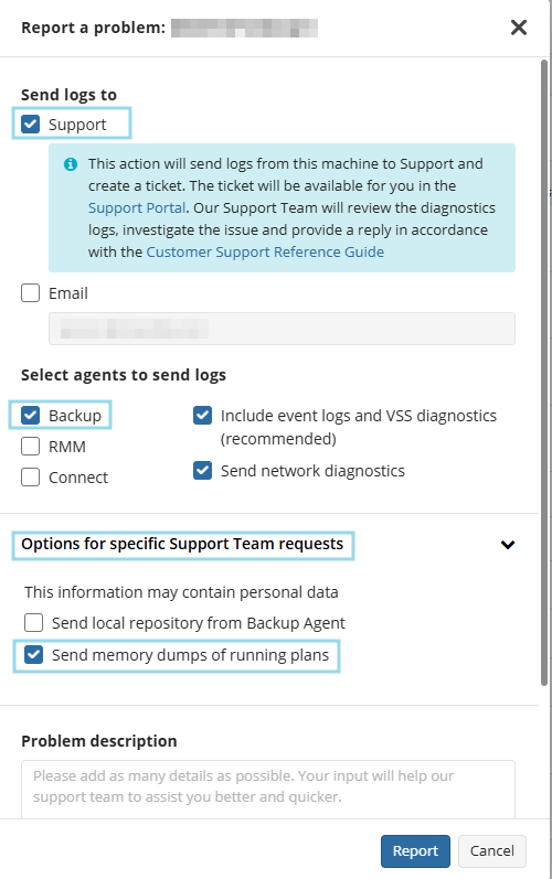 - Select the option to Send logs to Support, select Backup, expand Options for specific Support Team requests, and select Send memory dumps of running plans